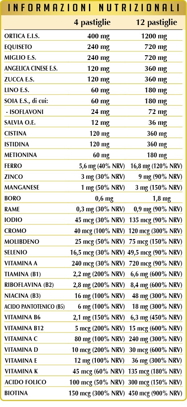 Integratore alimentare a base di erbe, sali minerali, vitamine e altri nutritivi. Ortica, equiseto, miglio e zinco aiutano a mantenere il benessere delle unghie e, insieme a selenio e biotina, favoriscono il mantenimento della salute dei capelli mentre il rame contribuisce alla loro normale pigmentazione.