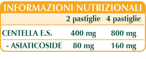 Centella (Centella asiatica) erba E.S. (titolato al 20% in derivati triterpenici totali, calcolati come asiaticoside), maltodestrine da mais o riso, cellulosa microcristallina°, gomma arabica°, silicio biossido°°, magnesio stearato di origine vegetale°°.