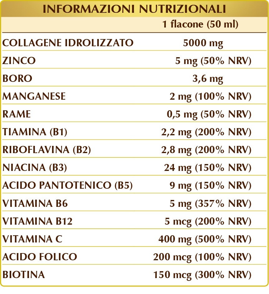 Glicerina vegetale bidistillata, acqua pura, collagene bovino idrolizzato, aroma caramello, vitamina C (acido ascorbico), zinco gluconato, vitamina B3 (nicotinamide), manganese gluconato; edulcoranti di origine naturale: glicosidi steviolici (E960) estratti da foglie di stevia e taumatina (E957) estratta da frutti di katemfe; vitamina B5 (pantotenato di calcio), rame gluconato, vitamina B6 (piridossina), vitamina B2 (riboflavina), vitamina B1 (tiamina), acido folico, biotina, vitamina B12 (cianocobalamina).