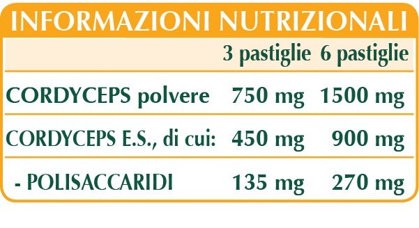 Cordyceps (Cordyceps sinensis) sporoforo (fungo) polvere, cordyceps (Cordyceps sinensis) sporoforo (fungo) E.S. (titolato al 30% in polisaccaridi), cellulosa microcristallina°, gomma arabica°, silicio biossido°°, magnesio stearato di origine vegetale°°.