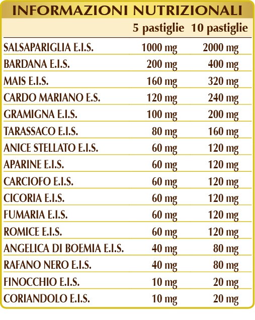 Salsapariglia (Smilax medica) radici E.I.S., bardana (Arctium lappa) erba e radici fresche E.I.S., cellulosa microcristallina°, gomma arabica°, mais o granoturco (Zea mays) stigmi E.I.S., cardo mariano (Silybum marianum) frutti E.S. (titolato all’80% in silimarina), gramigna (Agropyrum repens) rizomi E.I.S., tarassaco (Taraxacum officinale) radici E.I.S., anice stellato (Illicium verum) frutti E.I.S., aparine (Galium aparine) erba con fiori E.I.S., carciofo (Cynara Scolymus) foglie E.I.S., cicoria (Cichorium intybus) radici E.I.S., fumaria (Fumaria officinalis) erba con fiori E.I.S., romice (Rumex crispus) radici E.I.S., angelica di Boemia (Angelica archangelica) radici E.I.S., silicio biossido°°, rafano nero (Raphanus sativus var. niger) radici E.I.S., finocchio (Foeniculum vulgare) frutti E.I.S., coriandolo (Coriandrum sativum) frutti E.I.S., magnesio stearato di origine vegetale°°.