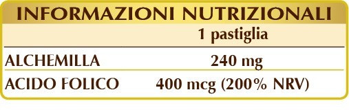 Alchemilla (Alchemilla vulgaris) erba polvere, cellulosa microcristallina°, gomma arabica°, silicio biossido°°, magnesio stearato di origine vegetale°°, acido folico.