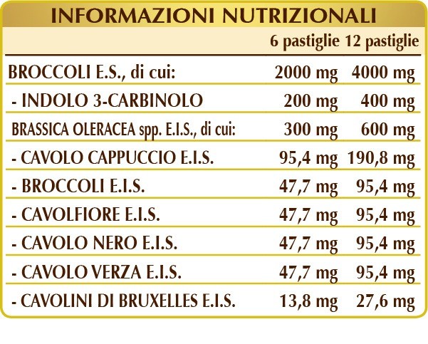 Broccoli (Brassica oleracea var. italica) erba con fiori E.S. (titolato al 10% in indolo 3-carbinolo), cellulosa microcristallina°, gomma arabica°, cavolo cappuccio (Brassica oleracea var. capitata) foglie E.I.S., broccoli (Brassica oleracea var. italica) erba con fiori E.I.S., cavolfiore (Brassica oleracea var. botrytis) erba con fiori E.I.S., cavolo nero (Brassica oleracea var. acephala) foglie E.I.S., cavolo verza (Brassica oleracea var. sabauda) foglie E.I.S., silicio biossido°°, cavolini di Bruxelles (Brassica oleraceavar. gemmifera) foglie E.I.S., magnesio stearato di origine vegetale°°. °Agente di carica. °°Antiagglomerante.