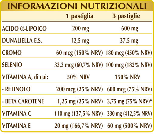Acido α-lipoico, vitamina C (acido ascorbico), cellulosa microcristallina°, vitamina E di origine naturale (acetato di D-α-tocoferile), gomma arabica°, dunaliella (Dunaliella salina) tallo (alga) E.S. (titolato al 10% in beta-carotene), silicio biossido°°, vitamina A (acetato di retinile), magnesio stearato di origine vegetale°°, cromo picolinato, sodio selenito.