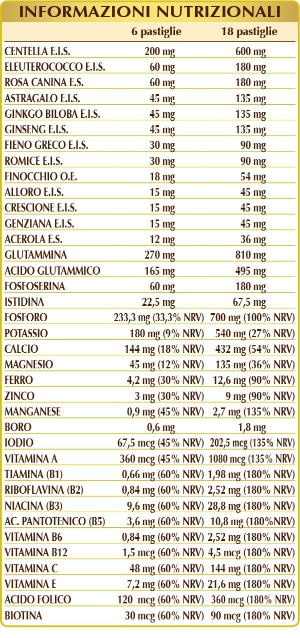 Calcio fosfato bibasico, potassio fosfato bibasico, magnesio glicerofosfato, (L-)glutammina, calcio glicerofosfato, cellulosa microcristallina°, gomma arabica°, centella (Centella asiatica) erba E.I.S., acido (L-)glutammico, silicio biossido°°, eleuterococco o ginseng siberiano (Eleutherococcus senticosus) radici E.I.S., (DL-)fosfoserina, rosa canina (Rosa canina) frutti E.S. (titolato al 70% in vitamina C), astragalo (Astragalus membranaceus) radici E.I.S, ginkgo biloba (Ginkgo biloba) foglie E.I.S., ginseng (Panax ginseng) radici E.I.S., fieno greco (Trigonella foenum-graecum) semi E.I.S., romice (Rumex crispus) radici E.I.S., citrato ferrico di ammonio, (L-)istidina, zinco gluconato, magnesio ossido, finocchio (Foeniculum vulgare) frutti O.E., vitamina E di origine vegetale (acetato di D-α-tocoferile), alloro (Laurus nobilis) foglie E.I.S., crescione (Nasturtium officinale) erba E.I.S., genziana (Genziana lutea) radici E.I.S., magnesio stearato di origine vegetale°°, acerola (Malpighia glabra) frutti E.S. (titolato al 50% in vitamina C), vitamina B3 (nicotinamide), manganese gluconato, sodio borato, vitamina B5 (pantotenato di calcio), vitamina A (acetato di retinile), vitamina B6 (piridossina cloridrato), vitamina B1 (tiamina cloridrato), vitamina B2 (riboflavina), acido folico, potassio ioduro, biotina, vitamina B12 (cianocobalamina).