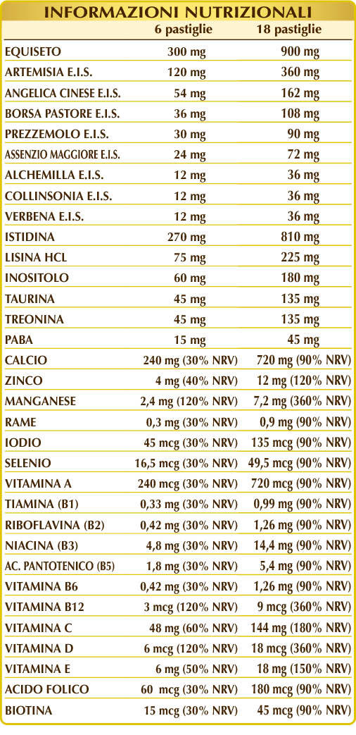 Calcio lattato, equiseto o coda cavallina (Equisetum arvense) erba polvere, (L-)istidina, calcio fosfato bibasico, cellulosa microcristallina°, gomma arabica°, artemisia (Artemisia vulgaris) erba con fiori E.I.S., calcio carbonato, (L-)lisina HCL o cloridrato, mio-inositolo di origine vegetale (estratto da semi di mais), angelica cinese (Angelica sinensis) radici E.I.S., vitamina C (acido ascorbico), taurina, (L-)treonina, borsa pastore (Capsella bursa-pastoris) erba E.I.S., silicio biossido°°, zinco gluconato, prezzemolo (Petroselinum crispum) frutti E.I.S., assenzio maggiore o romano (Artemisia absinthium) erba con fiori E.I.S., manganese gluconato, PABA (acido p-aminobenzoico), vitamina E di origine vegetale (acetato di D-α-tocoferile), magnesio stearato di origine vegetale°°, alchemilla (Alchemilla vulgaris) erba E.I.S., collinsonia (Collinsonia canadensis) radici E.I.S., verbena (Verbena officinalis) erba con fiori E.I.S., vitamina B3 (niacina), rame gluconato, vitamina B5 (pantotenato di calcio), vitamina A (acetato di retinile), vitamina B6 (piridossina cloridrato), vitamina B1 (tiamina cloridrato), vitamina B2 (riboflavina), acido folico, potassio ioduro, sodio selenito, biotina, vitamina D3 (colecalciferolo) di origine vegetale (estratta da lichene Cladonia rangiferina), vitamina B12 (cianocobalamina).