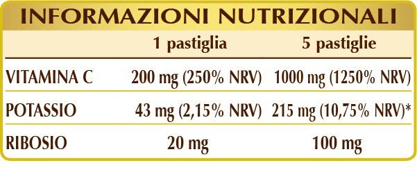 Potassio ascorbato, cellulosa microcristallina°, gomma arabica°, ribosio, silicio biossido°°, magnesio stearato di origine vegetale°°.