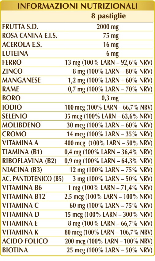 Frutta in polvere: albicocca (Prunus armeniaca), fragola (Fragaria ananassa), mirtillo (Vaccinium myrtillus); fruttosio, cellulosa microcristallina°, gomma arabica°, calcio fosfato bibasico°, ferro gluconato, rosa canina (Rosa canina) frutti E.I.S. (titolato al 70% in vitamina C), zinco gluconato, tagete (Tagetes erecta) fiori E.S. (titolato al 10% in luteina), magnesio stearato di origine vegetale°°, vitamina E di origine naturale (acetato di D-α-tocoferile), acerola (Malpighia glabra) frutti E.S. (titolato al 50% in vitamina C), vitamina B3 (nicotinamide), manganese gluconato, lichene (Cladonia rangiferina) tallo E.S. (titolato in vitamina D3 colecalciferolo 100.000 UI/g), rame gluconato, vitamina B5 (pantotenato di calcio); edulcoranti di origine naturale: glicosidi steviolici da stevia, taumatina; sodio borato, vitamina A (acetato di retinile), vitamina B2 attivata (riboflavina 5-fosfato di sodio), vitamina B6 attivata (piridossale-5-fosfato), vitamina B1 (tiamina cloridrato), acido folico attivato (L-metilfolato di calcio), potassio ioduro, cromo picolinato, sodio selenito, vitamina K1 (fillochinone), sodio molibdato, biotina, vitamina B12 attivata (5-deossiadenosilcobalamina, metilcobalamina). °Agente di carica °°Antiagglomerante.