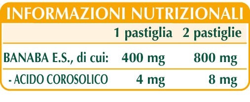 Banaba (Lagerstroemia speciosa) foglie E.S. (titolato all’1% in acido corosolico), cellulosa microcristallina°, gomma arabica°, biossido di silicio°°, magnesio stearato di origine vegetale°°.