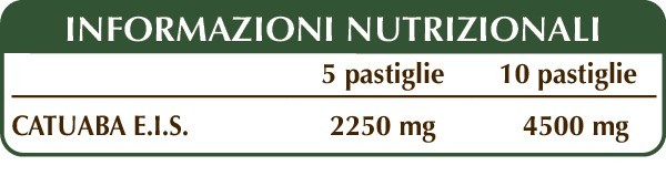 Catuaba (Erythroxylum catuaba) cortecce E.I.S., cellulosa microcristallina°, gomma arabica°, silicio biossido°°, magnesio stearato di origine vegetale°°.