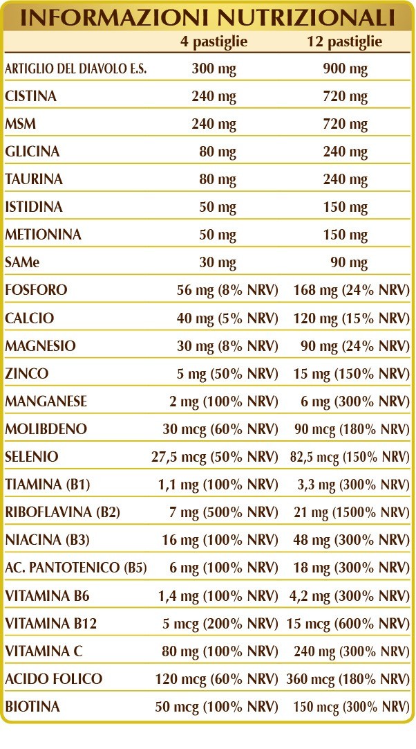 Artiglio del diavolo (Harpagophytum procumbens) radici E.S. (titolato al 4% in arpagoside), cellulosa microcristallina°, gomma arabica°, (L-)cistina, MSM (metilsulfonilmetano), calcio fosfato bibasico, magnesio glicerofosfato, glicina, taurina, vitamina C (acido ascorbico), SAMe (S-adenosil metionina disolfato tosilato), (L-)istidina, (L-)metionina, silicio biossido°°, zinco gluconato, magnesio ossido, manganese gluconato, vitamina B3 (nicotinamide), magnesio stearato di origine vegetale°°, vitamina B2 (riboflavina), vitamina B5 (pantotenato di calcio), vitamina B6 (piridossina cloridrato), vitamina B1 (tiamina cloridrato), acido folico, sodio molibdato, sodio selenito, biotina, vitamina B12 (cianocobalamina). °Agente di carica. °°Antiagglomerante.