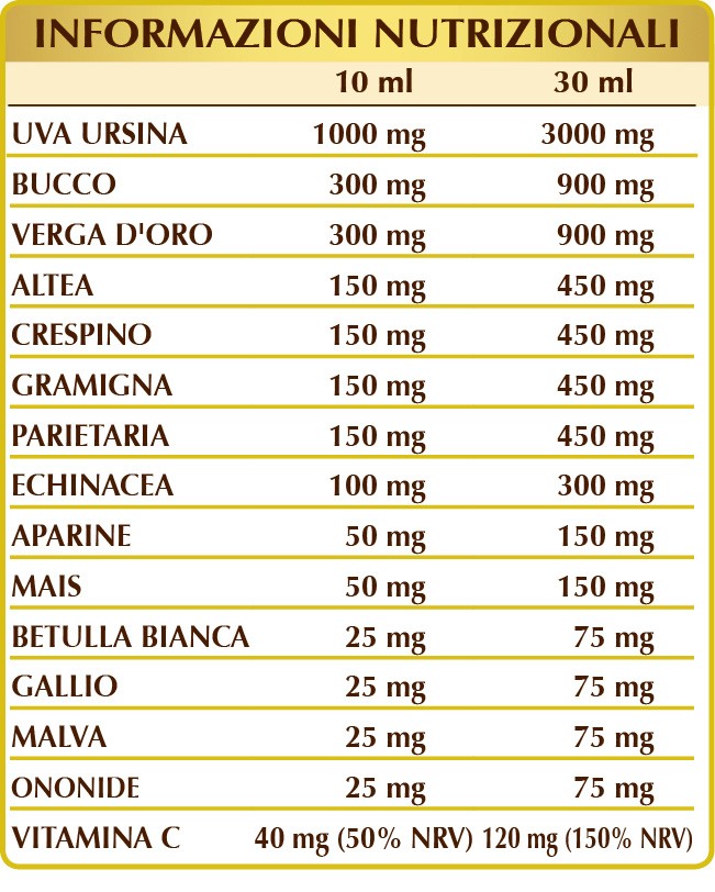 Acqua pura, glicerina vegetale bidistillata, uva ursina (Arctostaphylos uva-ursi) foglie, bucco (Barosma betulina) foglie, ginepro (Juniperus communis) galbuli (frutti), verga d’oro (Solidago virga-aurea) erba con fiori, aparine (Galium aparine) erba con fiori, crespino (Berberis vulgaris) cortecce delle radici, mais o granoturco (Zea mays) stigmi, echinacea (Echinacea angustifolia, pallida e purpurea) radici, altea (Althaea officinalis) radici, gallio (Galium verum) erba con fiori, pioppo nero (Populus nigra) gemme, malva (Malva sylvestris) foglie, marrubio (Marrubium vulgare) erba con fiori, rhus aromatica (Rhus aromatica) cortecce delle radici, rosa canina (Rosa canina) frutti E.S. (titolato al 50% in vitamina C), baptisia (Baptisia tinctoria) radici, betulla bianca (Betula alba o pubescens) foglie, calendula (Calendula officinalis) capolini (fiori), gramigna (Agropyron repens) rizomi, ononide (Ononis spinosa) radici, parietaria (Parietaria officinalis) erba, salvia (Salvia officinalis) foglie, timo volgare (Thymus vulgaris) foglie; edulcoranti di origine naturale: glicosidi steviolici (E960) estratti da foglie di stevia e taumatina (E957) estratta da frutti di katemfe.