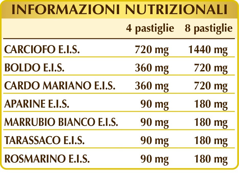 Carciofo (Cynara scolymus) foglie E.I.S., boldo (Peumus boldus) foglie E.I.S., cardo mariano (Silybum marianum) frutti E.I.S., cellulosa microcristallina°, gomma arabica°, marrubio bianco (Marrubium vulgare) erba con fiori E.I.S., tarassaco (Taraxacum officinale) radici E.I.S., aparine (Galium aparine) erba con fiori E.I.S., rosmarino (Rosmarinus officinalis) foglie E.I.S., silicio biossido°°, magnesio stearato di origine vegetale°°.