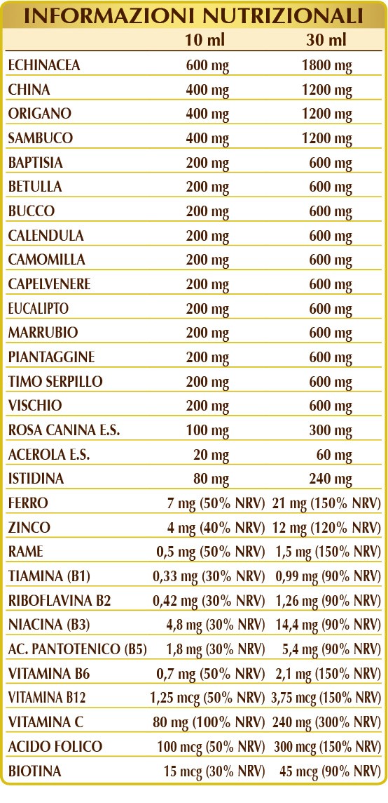 Glicerina vegetale bidistillata, acqua pura, echinacea (Echinacea angustifolia, purpurea e pallida) radici E.I.L., china (Cinchona calisaya) cortecce E.I.L., origano (Origanum vulgare) foglie E.I.L., sambuco (Sambucus nigra) fiori E.I.L., baptisia (Baptisia tinctoria) radici E.I.L., betulla bianca (Betula alba o pubescens) foglie E.I.L., bucco (Barosma betulina) foglie E.I.L., calendula (Calendula officinalis) capolini (fiori) E.I.L., camomilla volgare (Matricaria chamomilla) capolini (fiori) E.I.L., capelvenere (Adiantum capillus-veneris) erba E.I.L., eucalipto (Eucalyptus globulus) foglie E.I.L., marrubio (Marrubium vulgare) erba con fiori E.I.L., piantaggine (Plantago lanceolata) foglie E.I.L., timo serpillo (Thymus serpyllum) foglie E.I.L., vischio (Viscum album) foglie e rametti E.I.L., rosa canina (Rosa canina) frutti E.I.S. (titolato al 70% in vitamina C), (L)istidina, ferro gluconato, zinco gluconato, acerola (Malpighia glabra) frutti E.S. (titolato al 50% in vitamina C); edulcoranti di origine naturale: glicosidi steviolici da stevia, taumatina; vitamina B3 (nicotinamide), rame solfato, vitamina B5 (pantotenato di calcio), vitamina B6 attivata (piridossale-5-fosfato), vitamina B1 (tiamina cloridrato), vitamina B2 attivata (riboflavina 5-fosfato di sodio), acido folico attivato (L-metilfolato di calcio), biotina, vitamina B12 attivata (5-deossiadenosilcobalamina, meticobalamina).