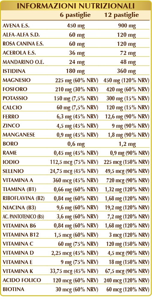 Magnesio glicerofosfato, avena (Avena sativa) frutti E.S., potassio fosfato bibasico, calcio fosfato bibasico, magnesio ossido, gomma arabica°, cellulosa microcristallina°, (L-)istidina, magnesio citrato, alfa-alfa o erba medica (Medicago sativa) erba con fiori S.D., rosa canina (Rosa canina) frutti E.S. (titolato al 70% in vitamina C), ferro gluconato, zinco gluconato, acerola (Malpighia glabra) frutti E.S. (titolato al 50% in vitamina C), silicio biossido°°, mandarino (Citrus reticulata) scorze dei frutti O.E., vitamina E di origine vegetale (acetato di D-α-tocoferile), magnesio stearato di origine naturale°°, vitamina B3 (nicotinamide), manganese gluconato, sodio borato, vitamina B5 (pantotenato di calcio), vitamina A (acetato di retinile), rame solfato, vitamina B6 (piridossina cloridrato), vitamina B1 (tiamina cloridrato), vitamina B2 (riboflavina), vitamina K1 (fillochinone), potassio ioduro, acido folico, sodio selenito, biotina, vitamina D3 (colecalciferolo) di origine vegetale (estratta da lichene Cladonia rangiferina), vitamina B12 (cianocobalamina).
