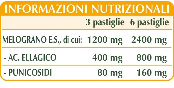 Melograno (Punica granatum) frutti E.S. (titolato al 40% in acido ellagico), melograno (Punica granatum) frutti E.S. (titolato al 40% in punicosidi), cellulosa microcristallina°, gomma arabica°, silicio biossido°°, magnesio stearato di origine vegetale°°.