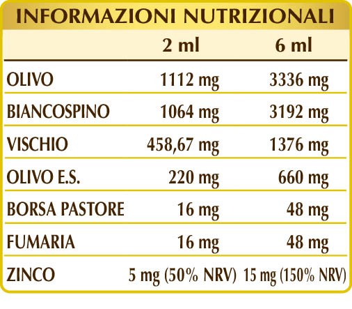 Acqua pura, alcool etilico (Alcoolvis®= Alcool purificato col metodo inventato dal Dr. Giorgini), olivo (Olea europaea) foglie E.I.L., biancospino (Crataegus oxyacantha) fiori e foglie E.I.L., vischio (Viscum album) erba E.I.L., borsa pastore (Capsella bursa-pastoris) erba E.I.L., fumaria (Fumaria officinalis) erba con fiori E.I.L.