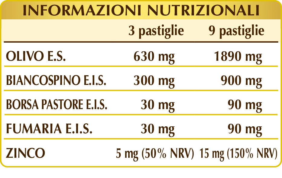 Olivo (Olea europaea) foglie E.S. (titolato al 40% in oleuropeina), biancospino (Crataegus oxyacantha) fiori e foglie E.S. (titolato al 40% in flavonoidi), gomma arabica°, cellulosa microcristallina°, borsa pastore (Capsella bursa-pastoris) erba E.I.S., fumaria (Fumaria officinalis) erba con fiori E.I.S., silicio biossido°°, magnesio stearato di origine vegetale°°. °Agente di carica. °°Antiagglomerante.