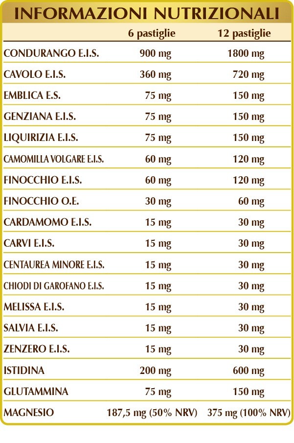 Condurango (Marsdenia condurango) cortecce dell’albero E.I.S., cavolo cappuccio (Brassica oleraceavar. capitata) foglie E.I.S., (L-)istidina, magnesio ossido, magnesio carbonato, magnesio trisilicato°°, cellulosa microcristallina°, gomma arabica°, emblica (Phyllanthus emblica) frutti E.S. (titolato al 30% in tannini), genziana (Gentiana lutea) radici E.I.S., (L-)glutammina, liquirizia (Glycyrrhiza glabra) radici E.I.S., camomilla (Matricaria chamomilla) capolini (fiori) E.I.S., finocchio (Foeniculum vulgare) frutti E.I.S., finocchio (Foeniculum vulgare) frutti O.E., cardamomo (Elettaria cardamomum) semi E.I.S., carvi o cumino dei prati (Carum carvi) frutti E.I.S., centaurea minore (Centaurium erythraea) sommità E.I.S., chiodi di garofano (Eugenia caryophyllata) gemme floreali E.I.S., melissa (Melissa officinalis) foglie E.I.S., salvia (Salvia officinalis) foglie E.S., zenzero (Zingiber officinalis) rizomi E.I.S., magnesio stearato di origine vegetale°°.