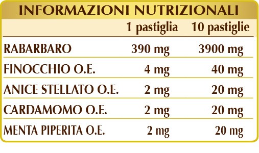 Rabarbaro cinese (Rheum palmatum) rizomi, cellulosa microcristallina°, gomma arabica°, silicio biossido°°, finocchio (Foeniculum vulgare) frutti O.E., anice stellato (Illicium verum) frutti O.E., cardamomo (Elettaria cardamomum) semi O.E., menta piperita (Mentha piperita) foglie O.E., magnesio stearato di origine vegetale°°.