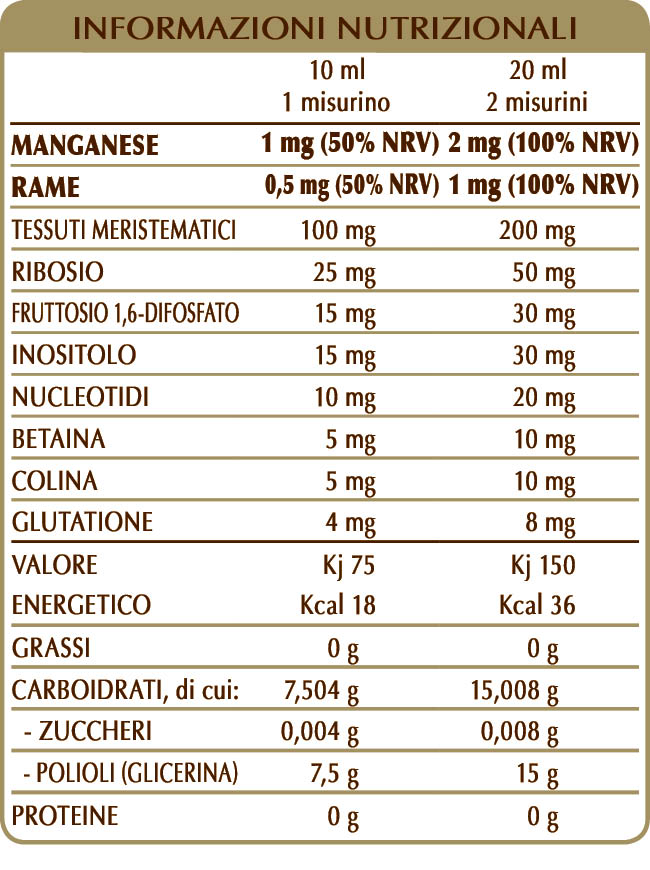 Glicerina vegetale bidistillata, acqua pura; tessuti meristematici freschi (1%): castagno (Castanea vesca, sinonimo Castanea sativa) gemme, ippocastano (Aesculus hippocastanum) gemme, noce (Juglans regia) gemme, prugnolo (Prunus spinosa) gemme; ribosio, fruttosio 1,6-difosfato; correttore di acidità: acido citrico; inositolo, betaina citrato, colina tartrato; miscela di nucleotidi: AMP (adenosina monofosfato), CMP (citosina monofosfato), GMP (guanosina monofosfato), UMP (uridina monofosfato); manganese gluconato, glutatione, rame gluconato; edulcorante di origine naturale: taumatina (E957).