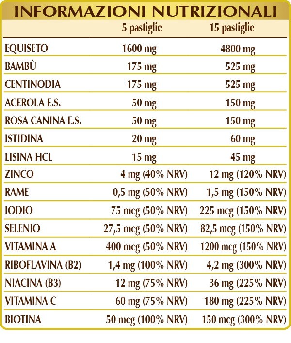 Equiseto o coda cavallina (Equisetum arvense) erba Plv, bambù (Bambusa vulgaris) giovani fusti Plv, centinodia (Polygonum aviculare) erba Plv, cellulosa microcristallina°, gomma arabica°, acerola (Malpighia glabra) frutti E.S. (titolato al 50% in vitamina C), rosa canina (Rosa canina) frutti E.S. (titolato al 70% in vitamina C), zinco gluconato, silicio biossido°°, (L-)istidina, (L-)lisina HCL o cloridrato, magnesio stearato di origine vegetale°°, vitamina B3 (nicotinamide), rame gluconato, vitamina A (acetato di retinile), vitamina B2 (riboflavina), potassio ioduro, sodio selenito, biotina.