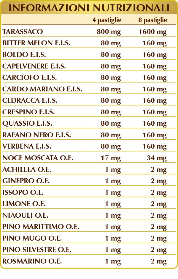 Tarassaco (Taraxacum officinale) foglie, cellulosa microcristallina°, gomma arabica°, boldo (Peumus boldus) foglie E.I.S., capelvenere (Adiantum capillus-veneris) erba E.I.S., carciofo (Cynara scolymus) foglie E.I.S., cardo mariano (Silybum marianum) erba E.I.S., crespino (Berberis vulgaris) cortecce delle radici E.I.S., bitter melon (Momordica charantia) frutti E.I.S., quassio (Quassia amara) legno E.I.S., rafano nero (Raphanus sativus var. niger) radici E.I.S., cedracca o spaccapietra (Ceterach officinarum) foglie E.I.S., verbena (Verbena officinalis) erba con fiori E.I.S., silicio biossido°°, magnesio stearato di origine vegetale°°, noce moscata (Myristica fragrans) frutti (noccioli) O.E., achillea (Achillea millefolium) erba con fiori O.E., ginepro (Juniperus communis) galbuli (frutti) O.E., issopo (Hyssopus officinalis) foglie O.E., limone (Citrus limon) scorze dei frutti O.E., niaouli (Melaleuca viridiflora) foglie O.E., pino marittimo (Pinus pinaster) aghi (foglie) O.E., pino mugo (Pinus mugo, montana o pumilio) aghi (foglie) O.E., pino silvestre (Pinus sylvestris) aghi (foglie) O.E., rosmarino (Rosmarinus officinalis) sommità fiorite O.E.