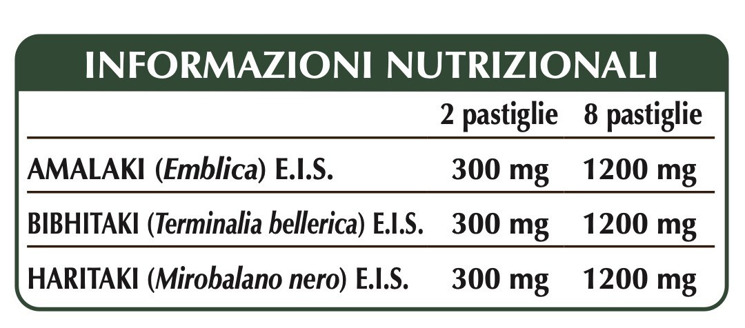 Emblica o amalaki (Phyllantus emblica o Emblica officinalis) frutti E.I.S., terminalia bellerica o bibhitaki (Terminalia bellerica) frutti E.I.S., mirobalano nero o haritaki (Terminalia chebula) frutti E.I.S., cellulosa microcristallina°, gomma arabica°, silicio biossido°°, magnesio stearato di origine vegetale°°.