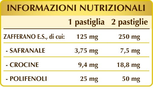 Maltodestrine da mais o riso, zafferano (Crocus sativus) stigmi E.S. (titolato al 3% in safranale, 7.5% in crocine e 20% in polifenoli), cellulosa microcristallina°, gomma arabica°, silicio biossido°°, magnesio stearato di origine vegetale°°.